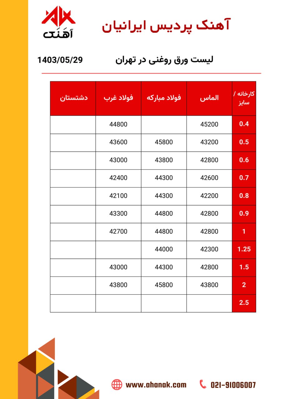 ⏱تاریخ :29 مرداد 1403 🔵 قیمت ورق روغنی 🔵 🏭 محل بارگیری تهران 📞 021-91006007 🌐 www.ahanak.com 🆔https://t.me/ahanak