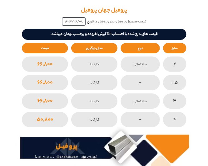 ⏱تاریخ : 1 خرداد 1403 📢 قیمت پروفیل ستونی 🏗 محل تحویل : انبار تهران 🔸3 میل| | ==> 39,500 🔹4میل | | ==> 39,500 📞 021-91006007 🌐 www.ahanak.com 🆔https: ...