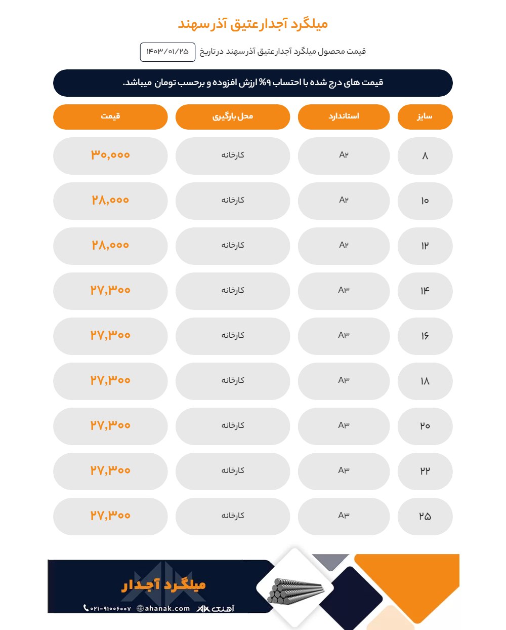 ⏱تاریخ : 19 فروردین 1403 🔵 قیمت میلگرد آجدار ابهر سیادن 🔵 🏭 محل بارگیری : کارخانه ▪️8 | A2 | ==> 30,600 ▪️10 | A3 | ==> 28,900 ▪️10 | A2 | ==> 28,600 ▪️12 ...