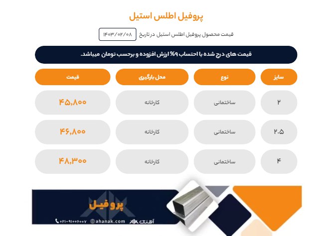 🔸 آهنک پردیس ایرانیان 🔸 ❗ لیست قیمت پروفیل اطلس استیل #قیمت_پروفیل #پروفیل_اطلس_استیل ارتباط با مشاوران خرید 👇 ℹ️ (داخلی 120) ...