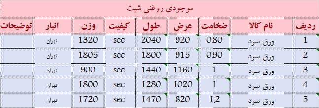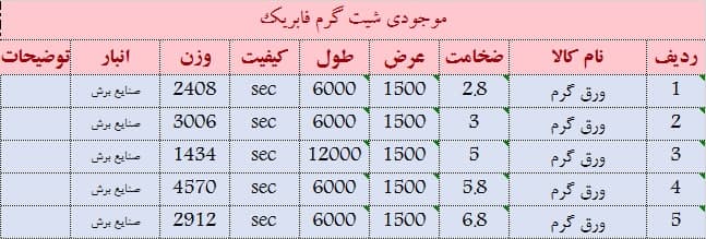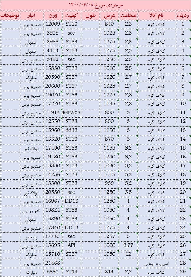 کلاف گرم 6 عرض 1100 موجود است کلاف گرم 8 عرض 1150 موجود است کلاف گرم 5.8 عرض 1120 موجود است کلاف گرم 5.9 عرض 1105 موجود است کلاف گرم 2 و 4 عرض 1000 موجود است