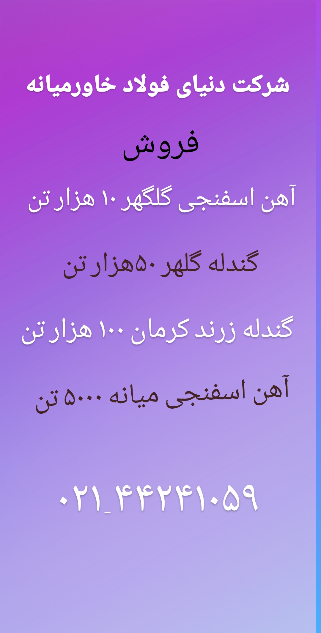 شرکت دنیای فولاد خاورمیانه ***** فروش میلگرد خرمدشت - شاهین بناب - بافق یزد - امیرکبیر - ذوب آهن - فایکو - حدیدسیرجان ***** تماس با ما : ۰۲۱۴۴۲۴۱۰۵۹ ۰۲۱۴۴۲۴۹۳۶ ...
