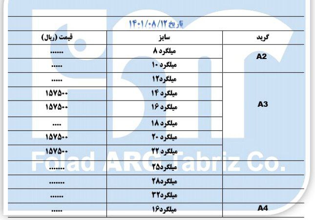 #فولادآذرامین تیکمه داش میلگرد آجدار A3 سایز 10 : 16570 میلگرد آجدار A2 سایز 8 : 16570 میلگرد آجدار A2 سایز10: 16370 میلگرد آجدار A3 سایز 12 : 16370 میلگرد آج ...