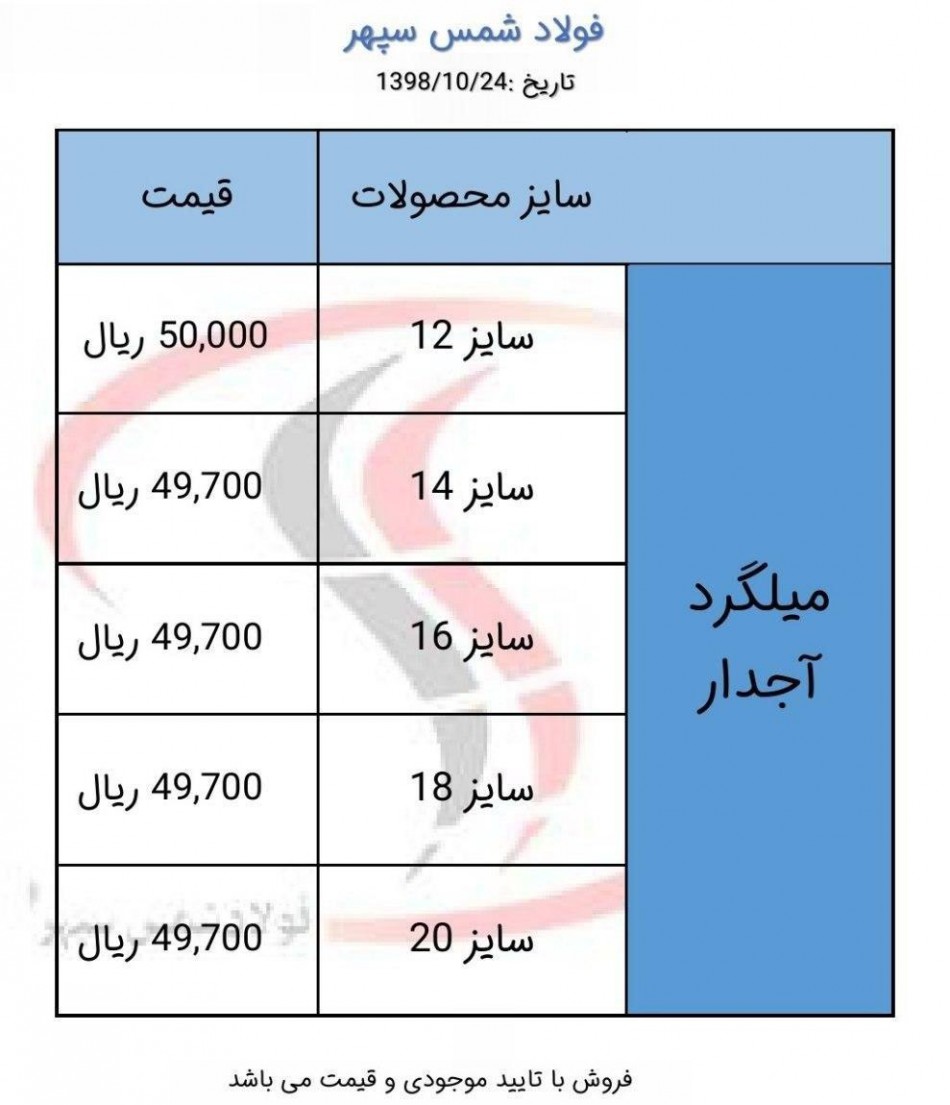 کارخانه #ابهر نسبت به آخرین اعلام رسمی قیمت امروز محصولات اعلامی خود را با 50 تومان #افزایش اعلام کرد. میلگرد 8 ) 56700 ریال میلگرد 10 ) ...