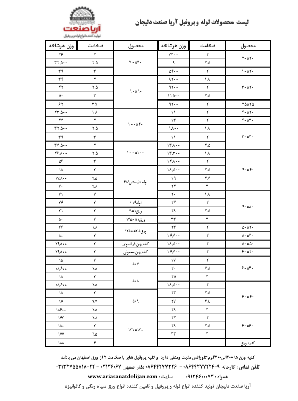 لیست محصولات لوله و پروفیل آریا صنعت دلیجان ۲۰*۱۰ ضخامت۲ وزن هرشاخه ۵/۴۰۰ ۲۰*۲۰ ضخامت۲ وزن هرشاخه ۷/۳۰۰ ۲۰*۲۰ ضخامت۲/۵ وزن هر شاخه ۹ ۲۵*۲۵ ضخامت۲ وزن هر شاخ ...