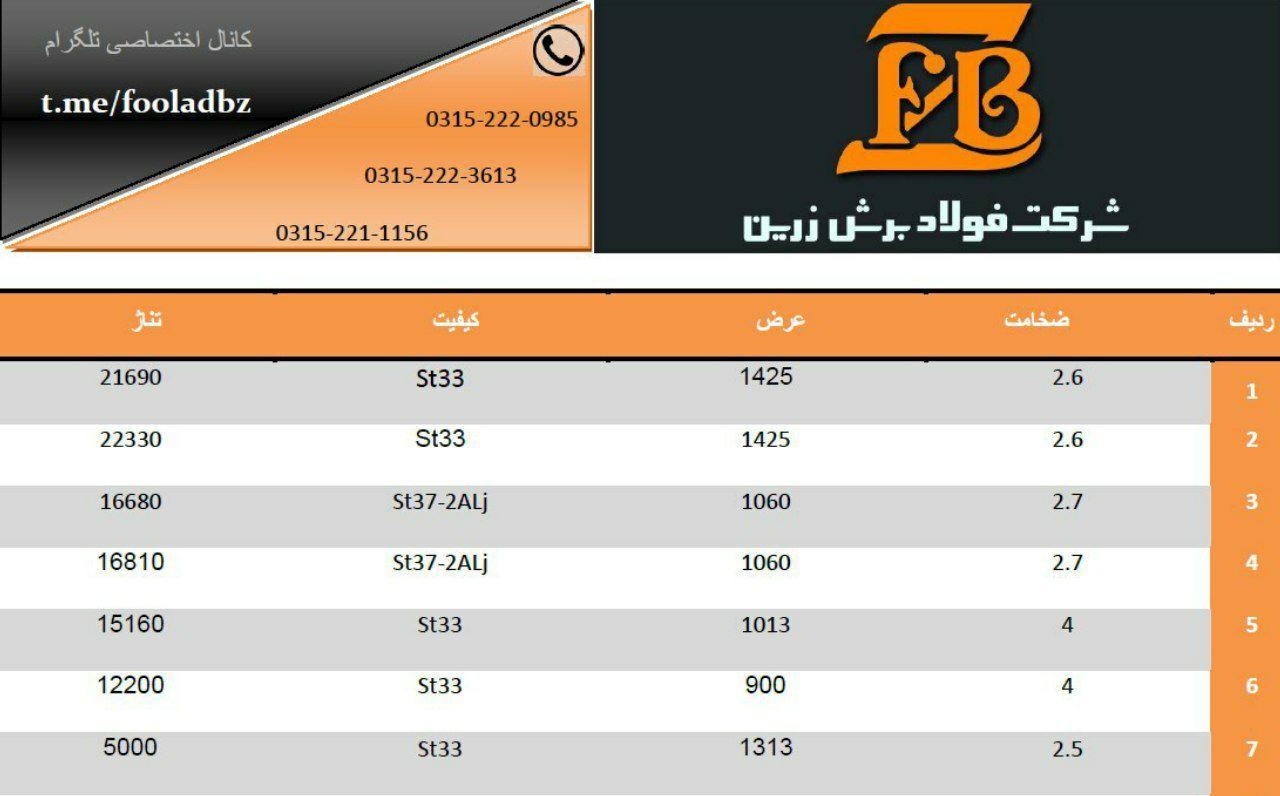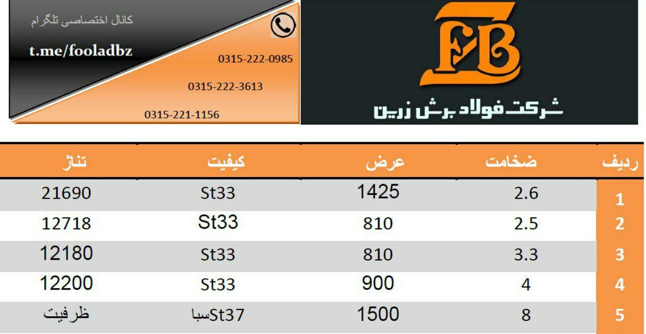 ورق های موجود به صورت تحویلی جهت اطلاع از قیمت ها 12 الی 13 تماس بگیرید. @fooladbz 03152223613 03152223104