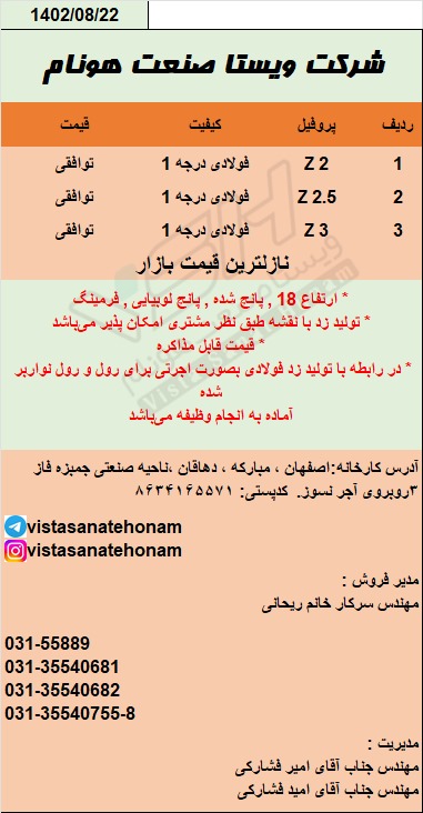 شرکت ویستا صنعت هونام تولید پروفیل زد با نازلترین قیمت بازار ضخامت : 2 2.5 3 *********************فروش ویژه پروفیل زد ضخامت 2****************** *************** ...