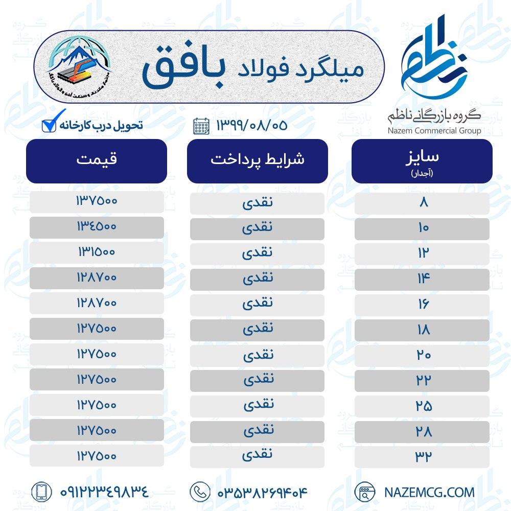 ❇️ گروه بازرگانی ناظم اعلام قیمت فولاد بافق 📆 یکشنبه 5 آبان 1399 قیمت‌ها با تایید می‌باشد. شماره تماس سفارشات و استعلام قیمت: 📞 03538269404 📞 03538269405 ...