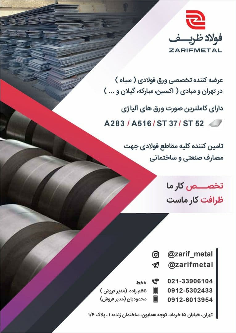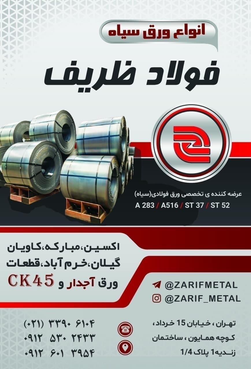 #فولاد_ظریف 💥عرضه کننده تخصصی ورق فولادی(سیاه) ⭕️اکسین، مبارکه، کاویان، گیلان، خرم آباد، قطعات، ورق آجدار و CK45 ✅A283 ✅A516 ✅ST37 ✅ST52 ☎️021 33906104 📲0912 ...