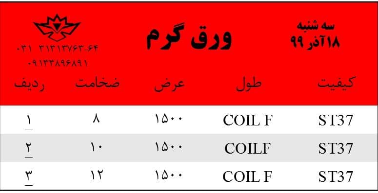 [ Photo ] 🔴شرکت بازرگانی #مهربد_تدبیر_زرین 🔴 موجودی امروز شنبه ۱۳ دیماه ۹۹ ورق گرم 2 1250 st37 4 1250 st37 5 1500 st37 6 1500 st37 ...