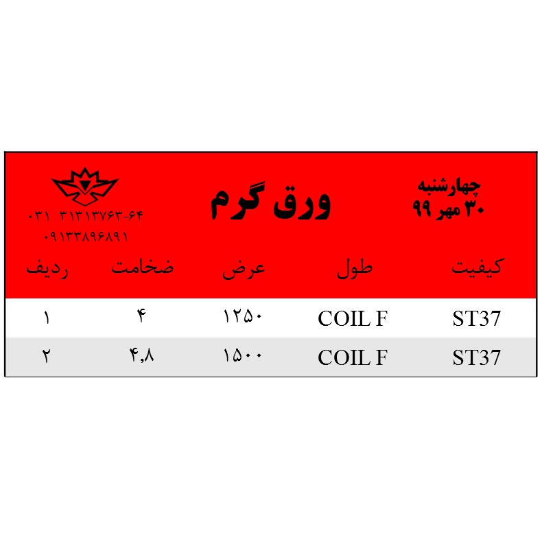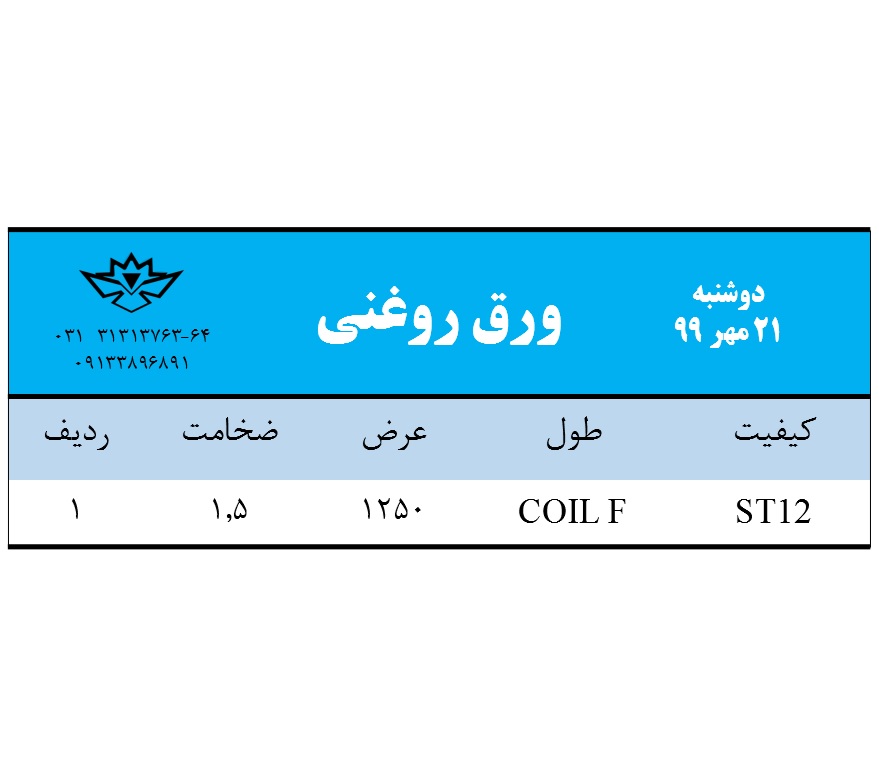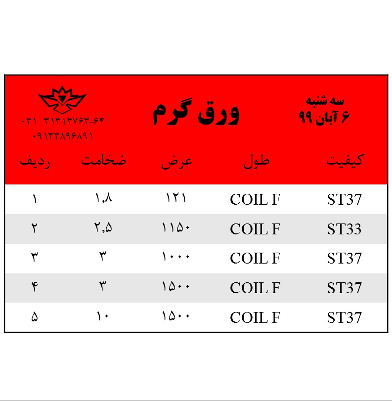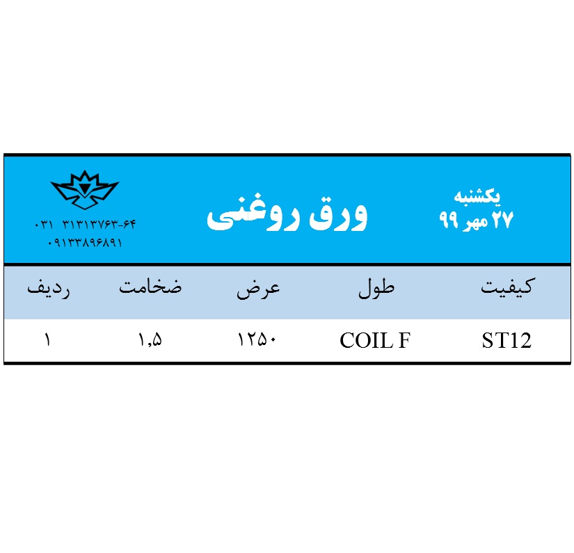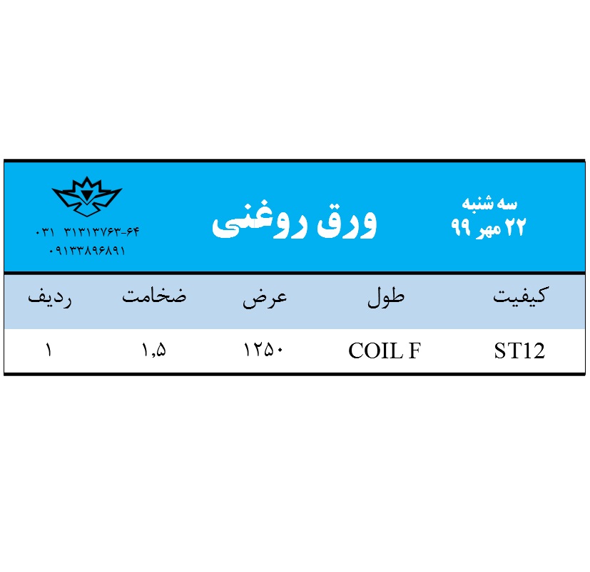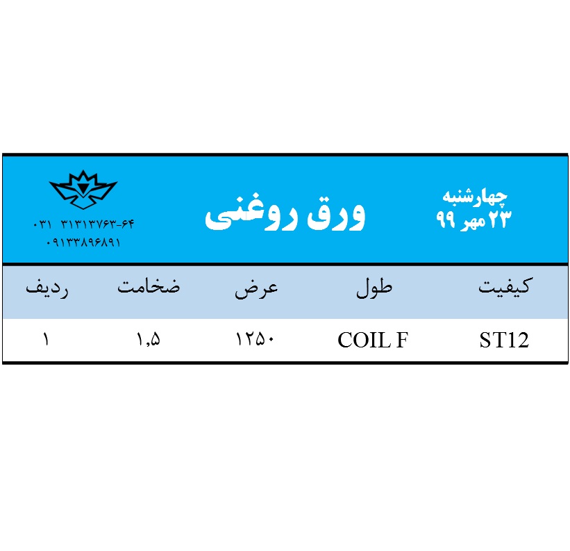 🔴شرکت بازرگانی #مهربد_تدبیر_زرین 🔴 صورت بار امروز👇🏻👇🏻 🔹ورق روغنی ۱.۵ عرض ۱۲۵۰ فولاد 📱09133896891 ☎️031-31313764 ☎️031-31313763