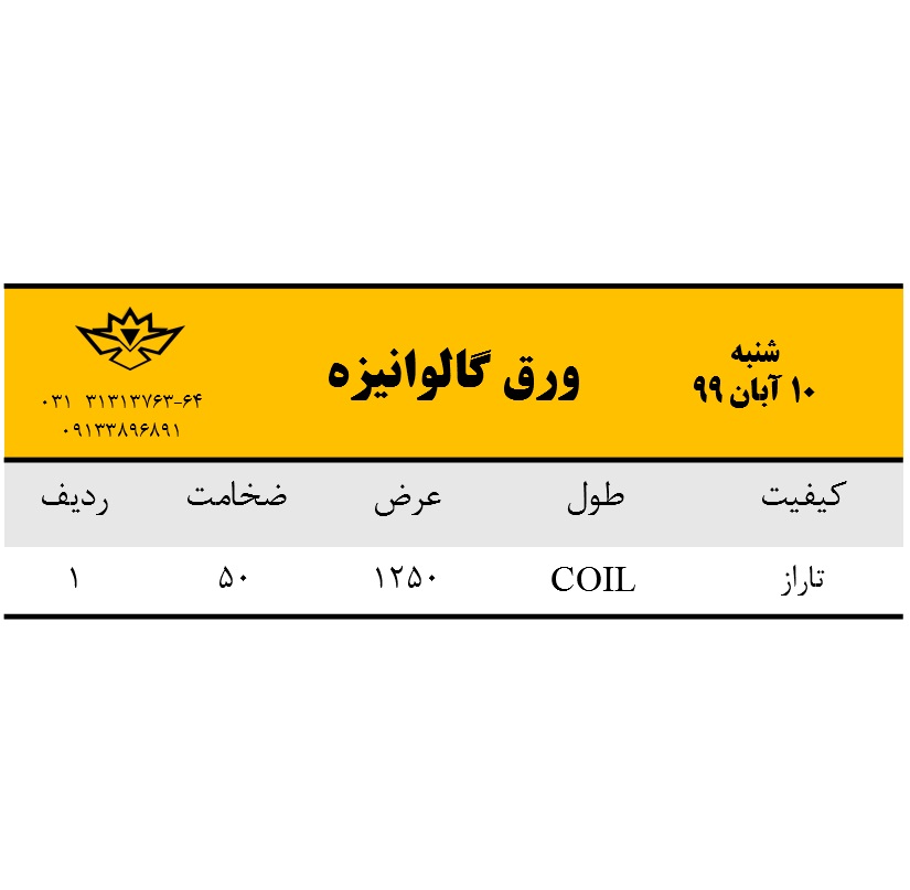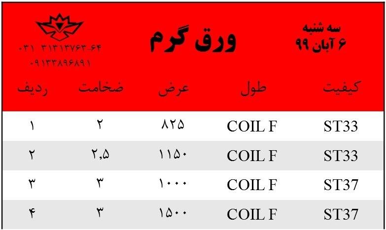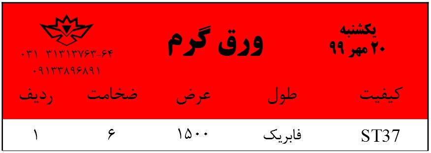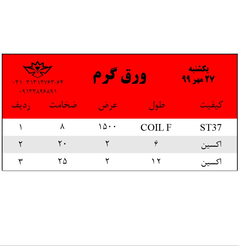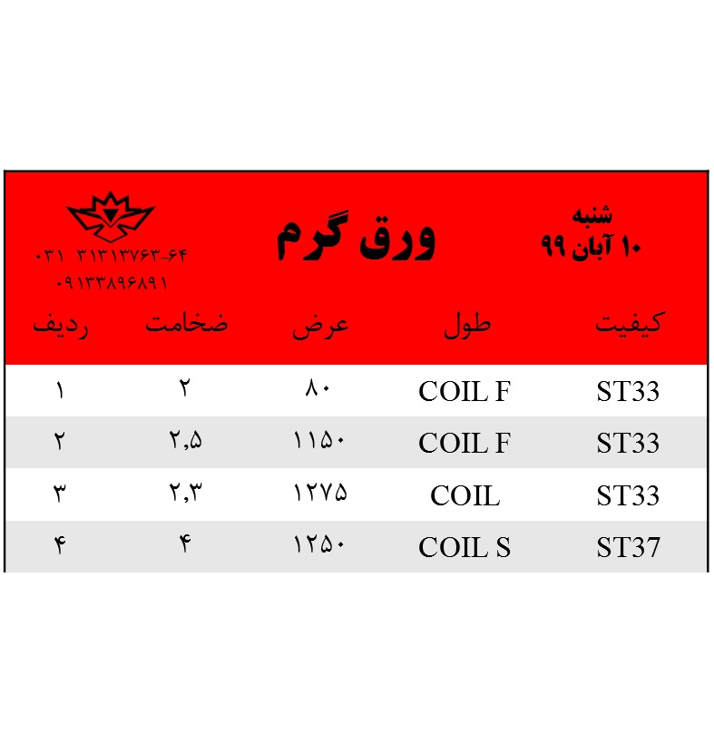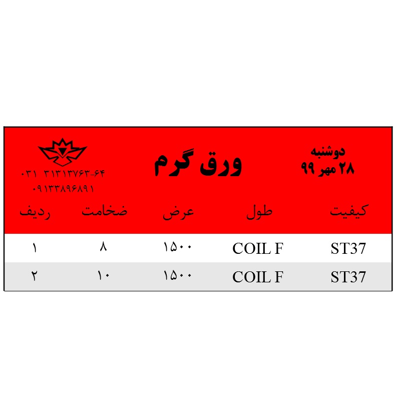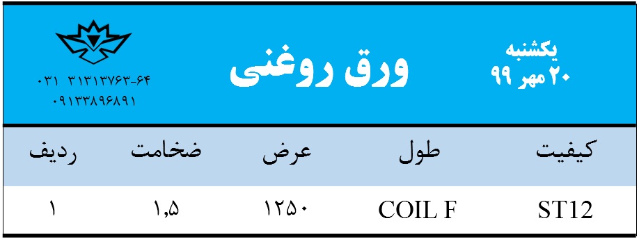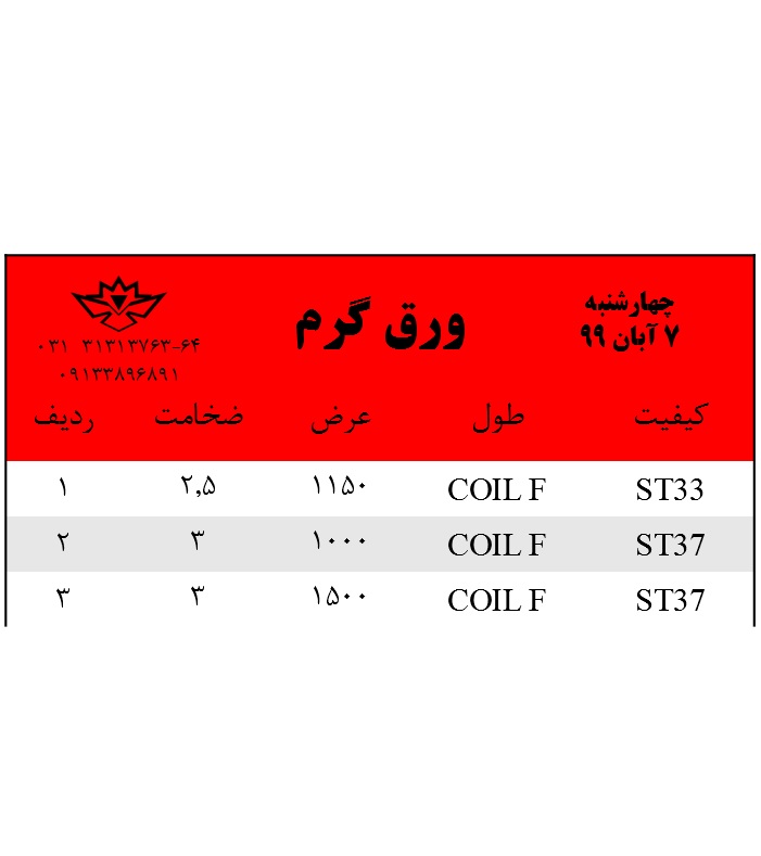 🔴شرکت بازرگانی #مهربد_تدبیر_زرین 🔴 صورت بار امروز👇🏻👇🏻 🔹ورق روغنی ۱.۵ عرض ۱۲۵۰ فولاد 📱09133896891 ☎️031-31313764 ☎️031-31313763