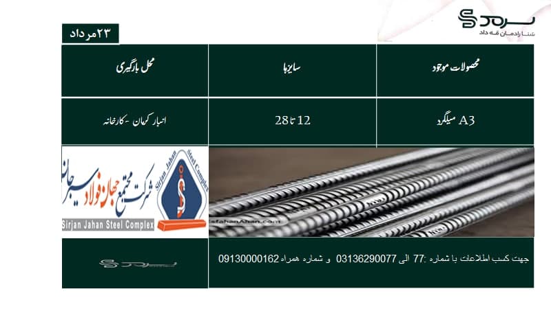 شنبه ١۴٠٠/٠۵/16 با سلام و روز بخیر لیست قیمت #میلگرد کارخانه جهان فولاد سیرجان#بارگیری انبار کرمان# میلگرد 18 الی28 آجدار:١68000 ریال ...