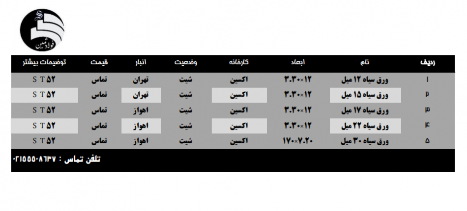 ورق اکسین st 52 ورق ۱۲ میل عرض ۳/۳۰در ۱۲ متر انبار تهران ورق ۱۵ میل عرض ۳/۳۰ در ۱۲ متر انبار تهران ورق ۱۷ میل عرض ۳/۳۰ در ۱۲ متر انبار اهواز ورق ۲ ...