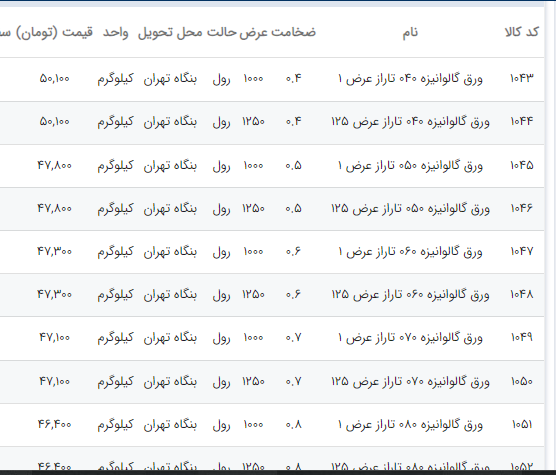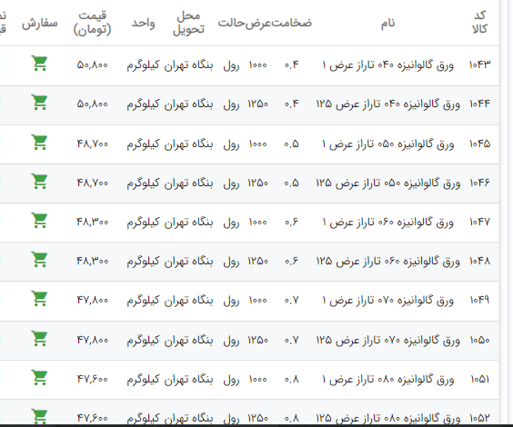 اعلام موجودی فولاد کبیر ورق گالوانیزه تاراز