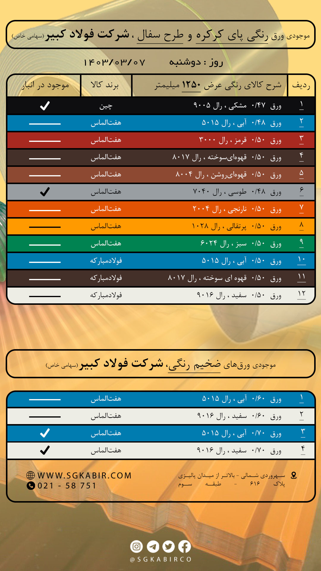 اعلام موجودی فولاد کبیر ورق گالوانیزه هفت الماس