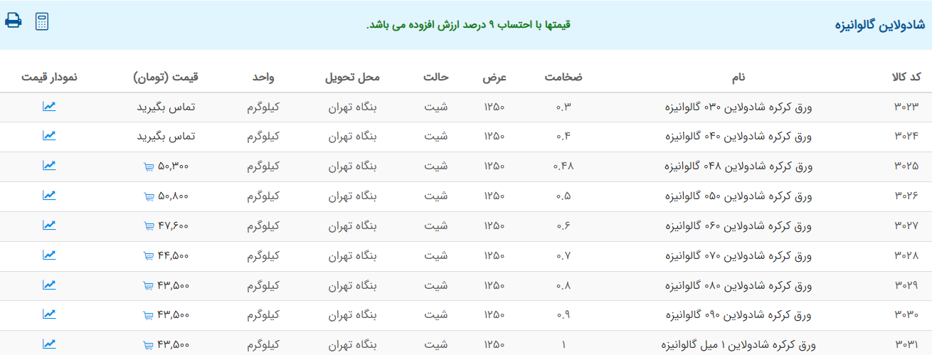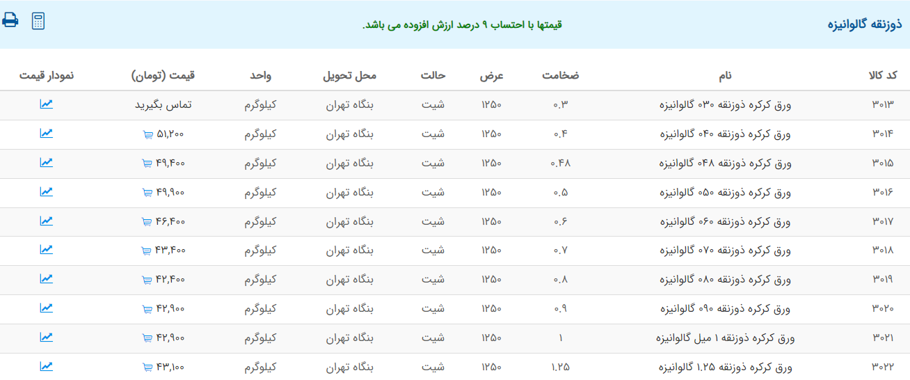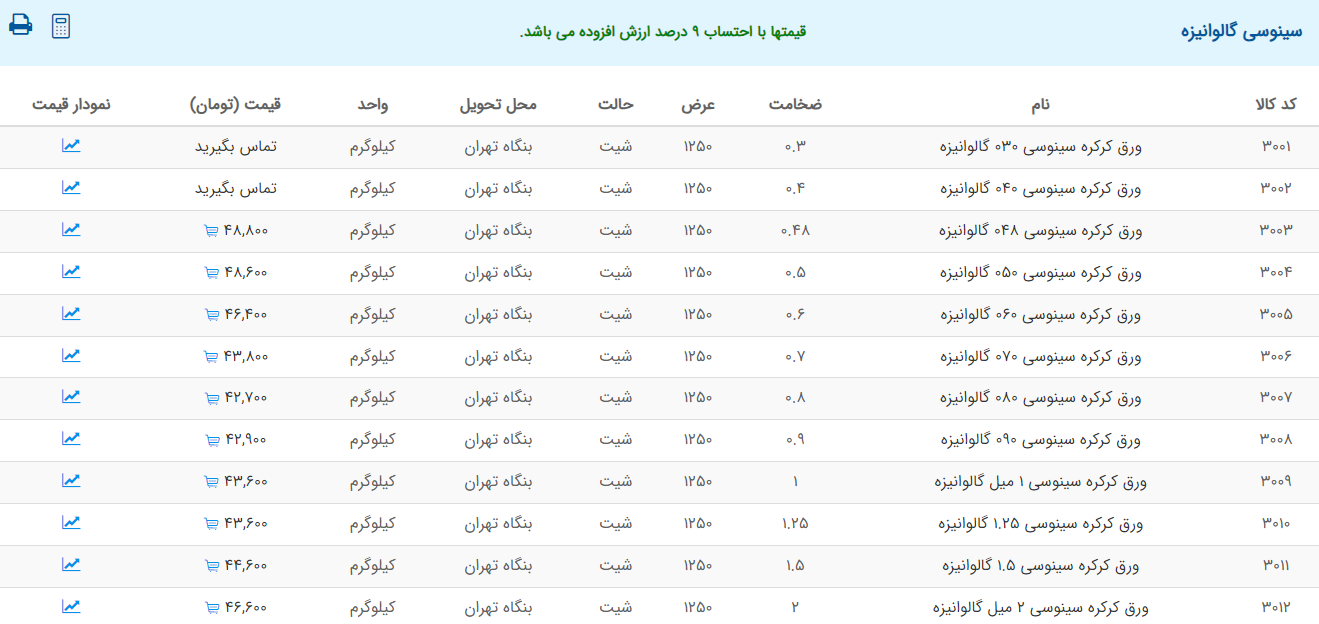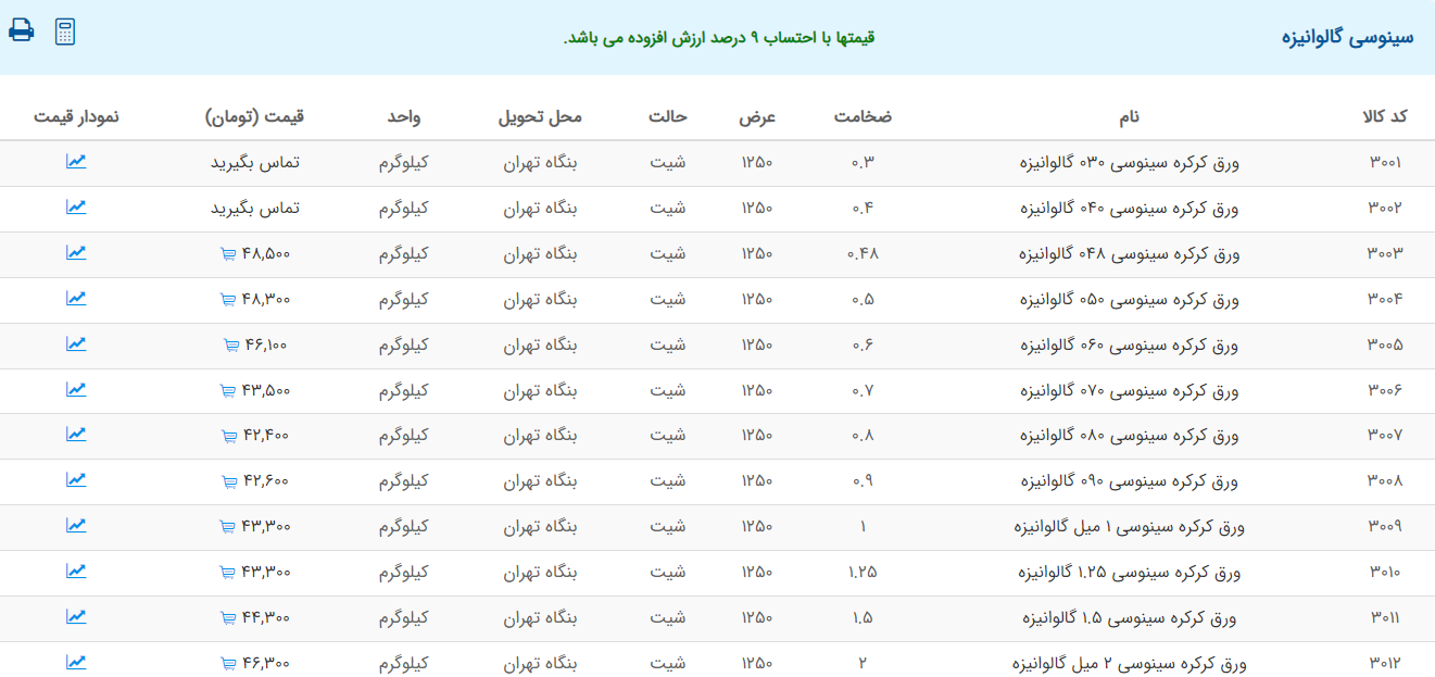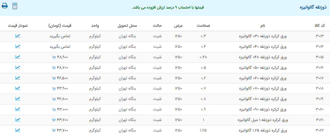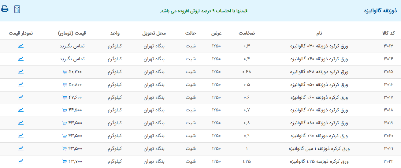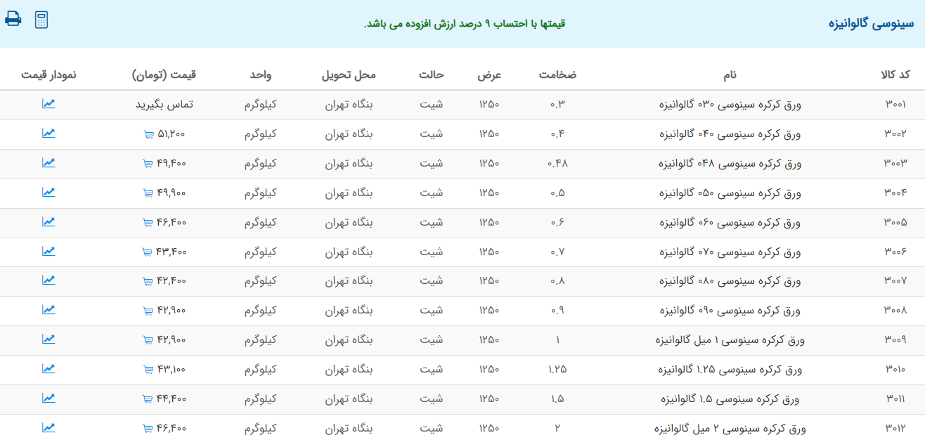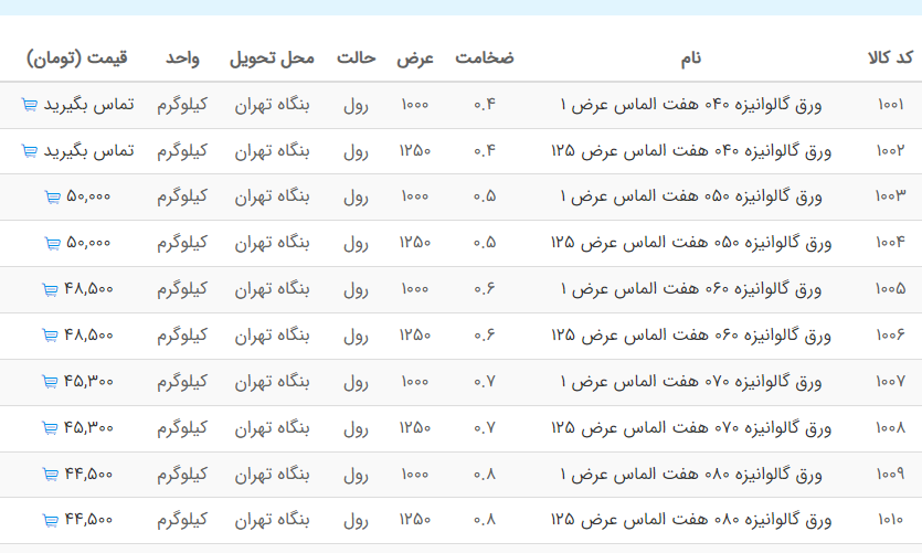 اعلام موجودی ورق گالوانیزه