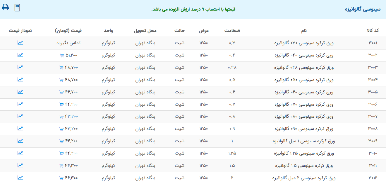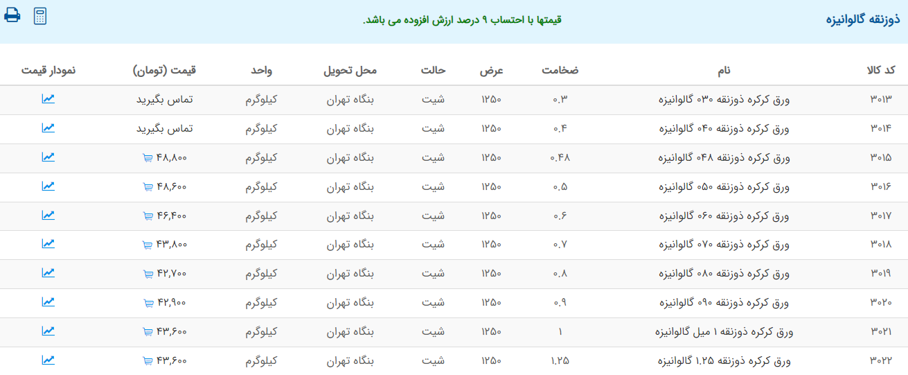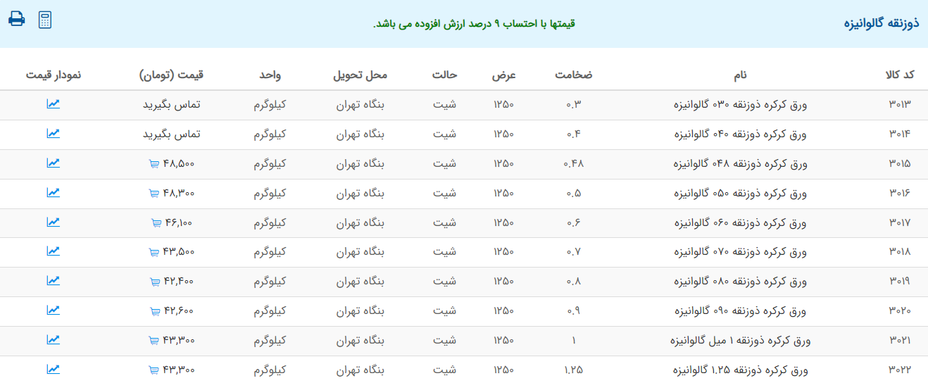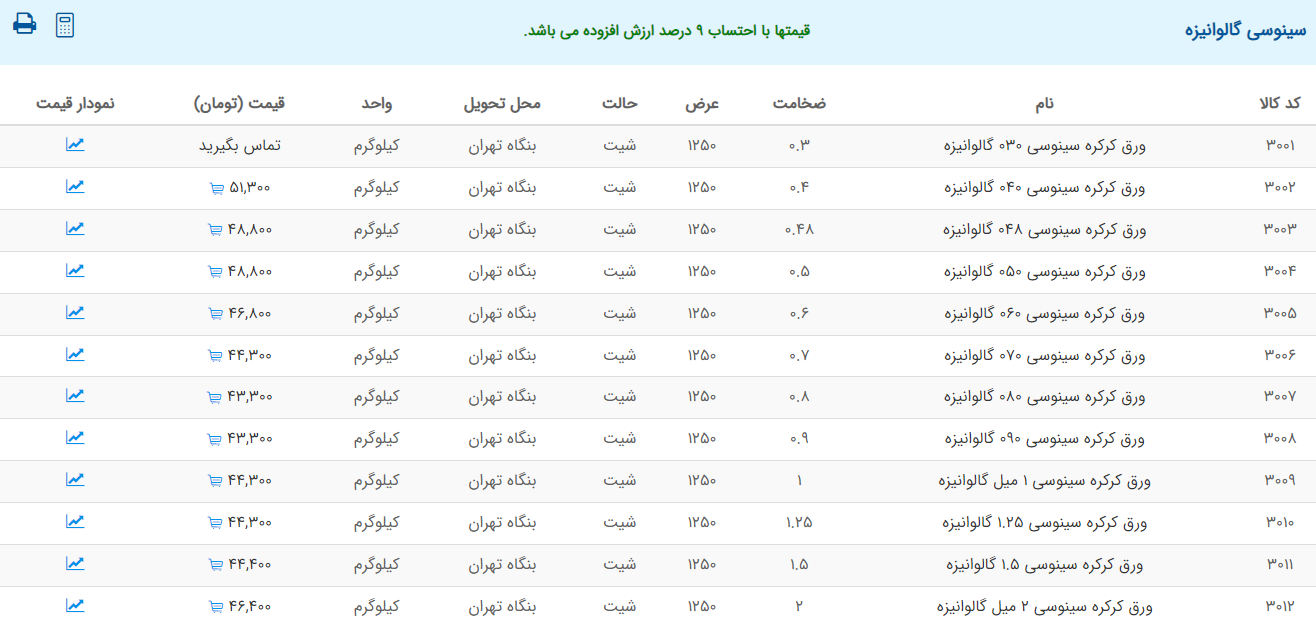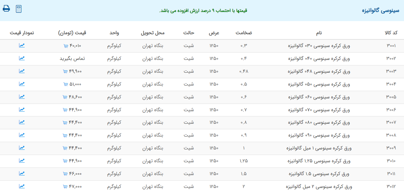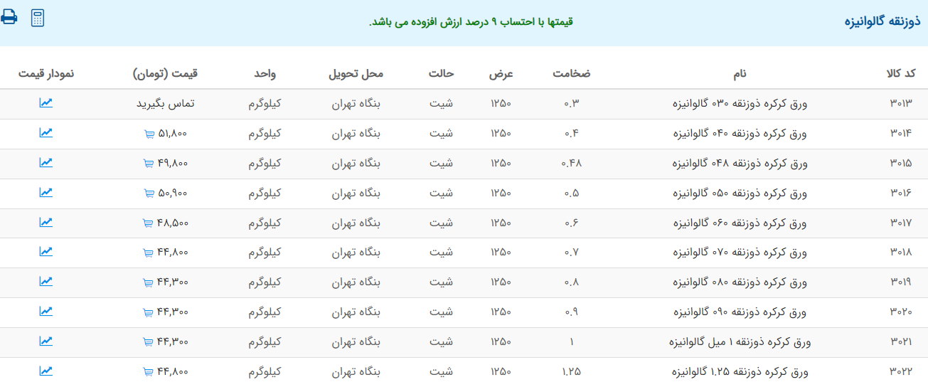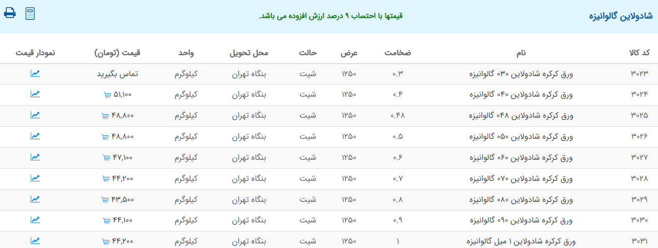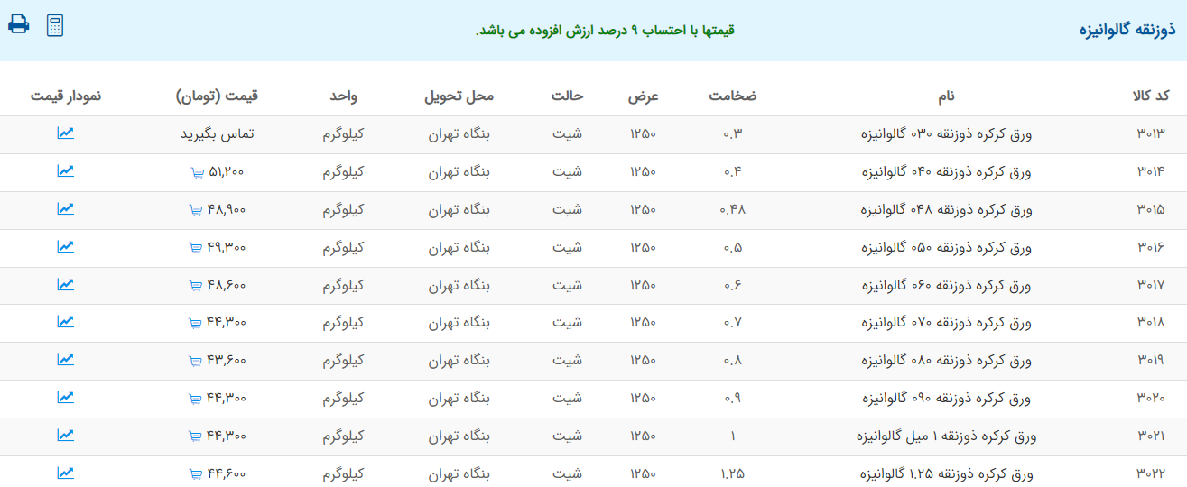 اعلام موجودی ورق گالوانیزه