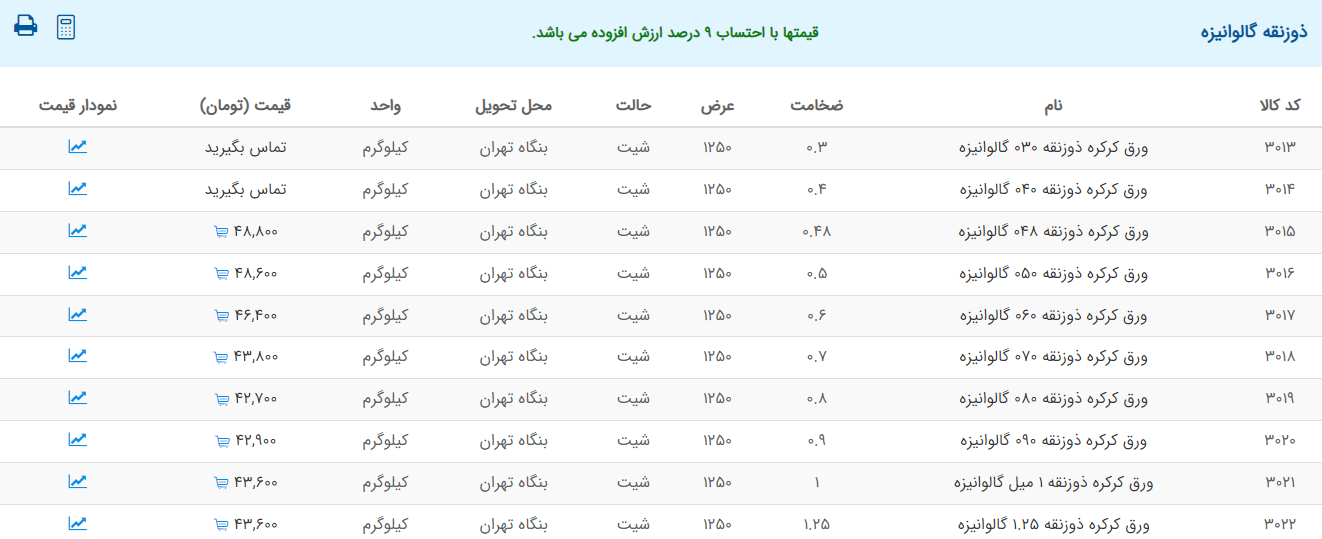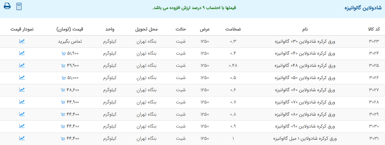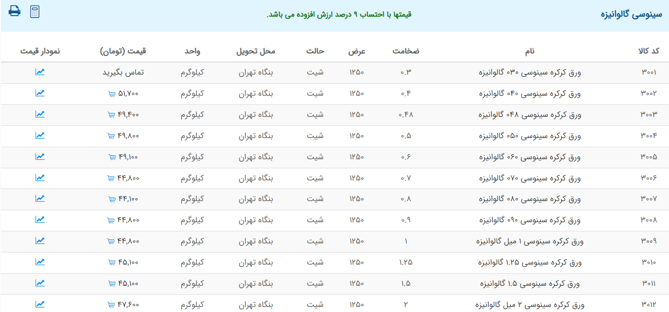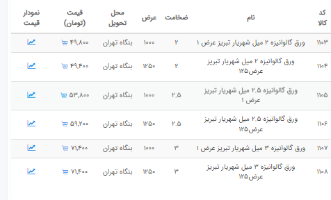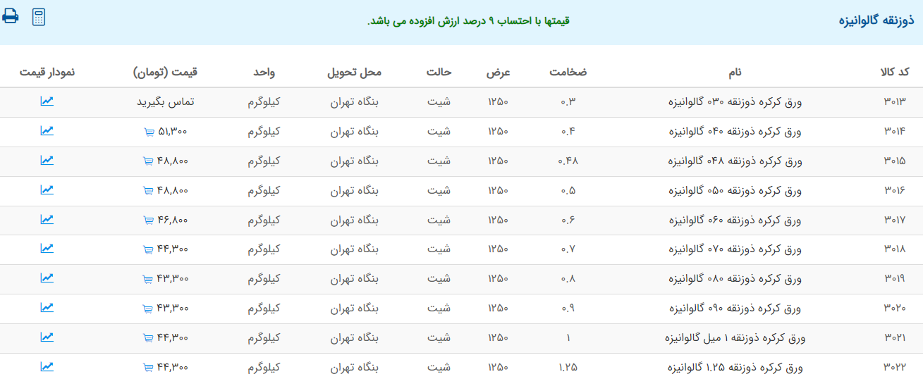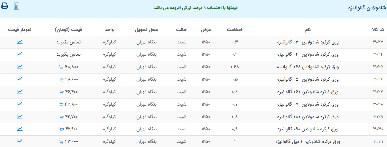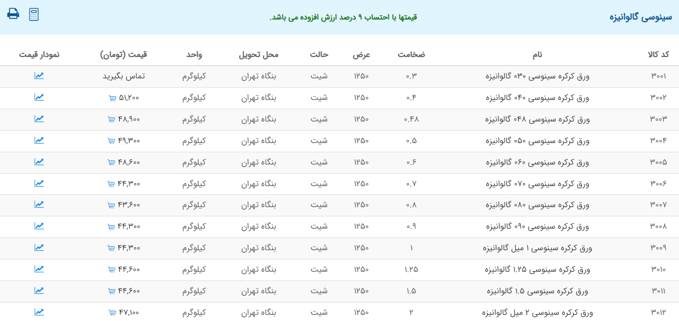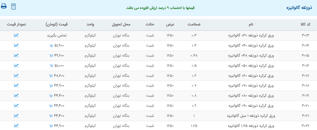 اعلام موجودی ورق گالوانیزه
