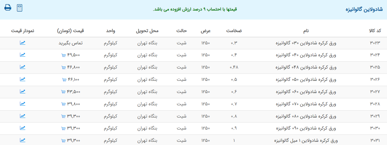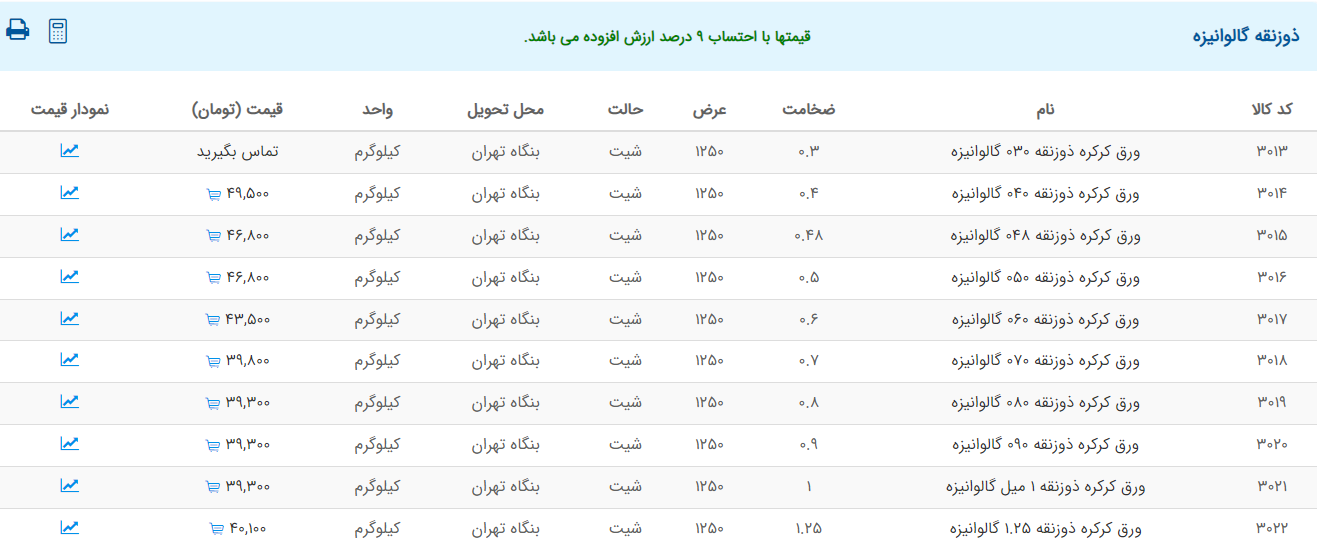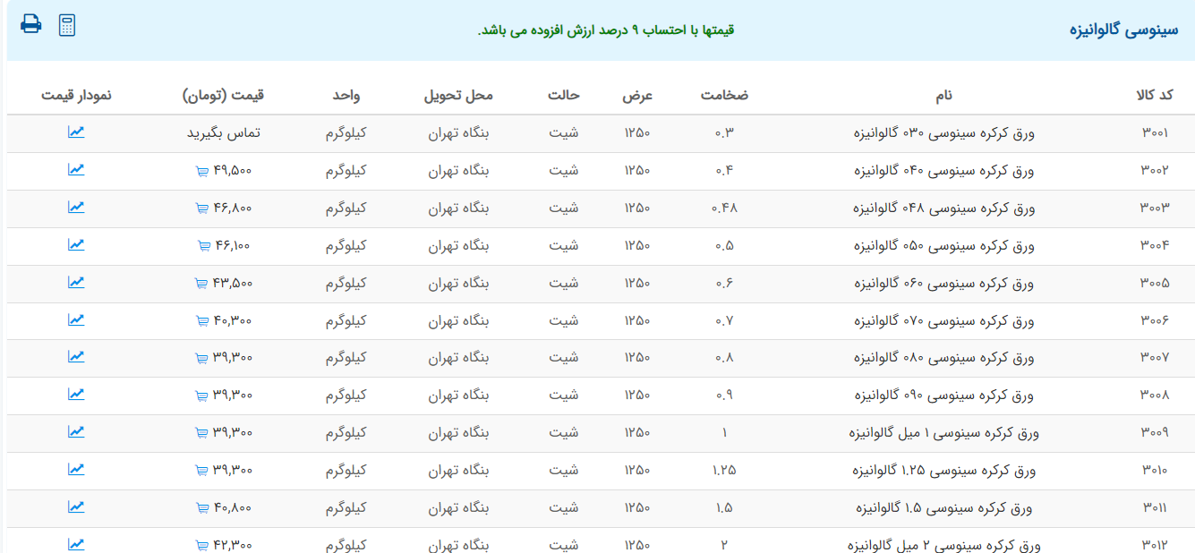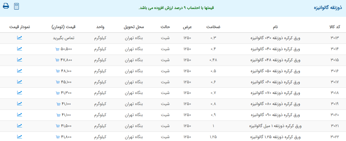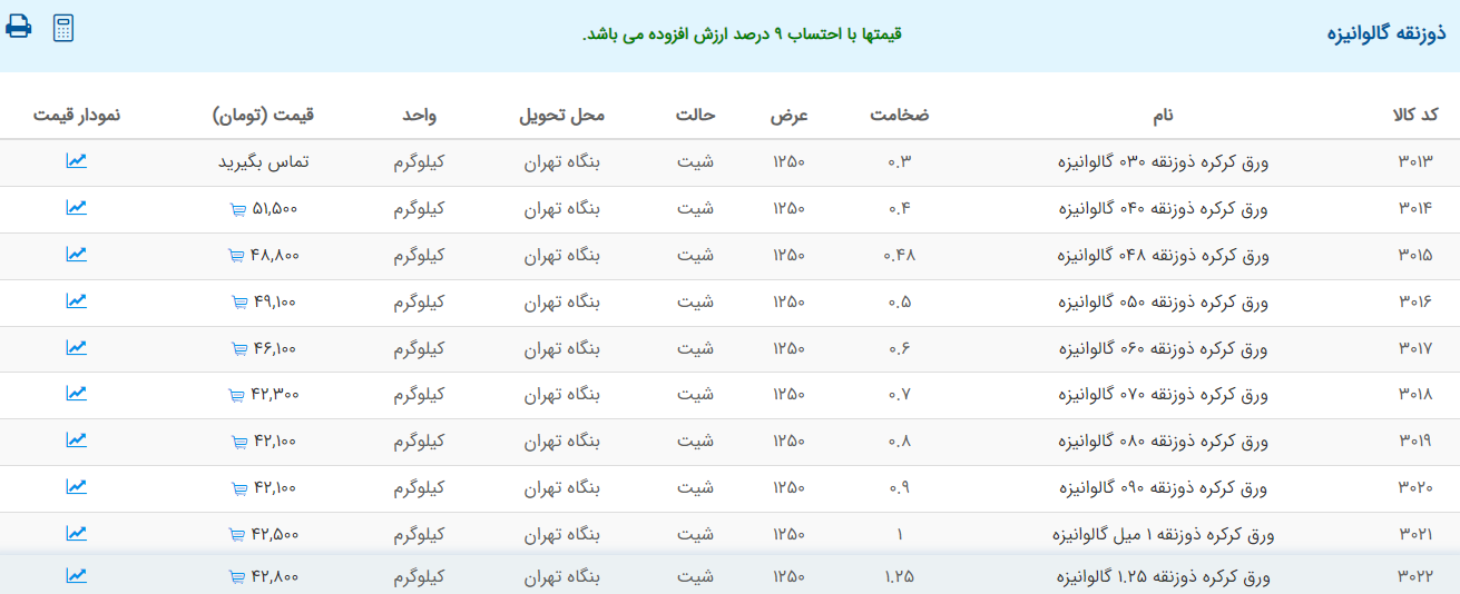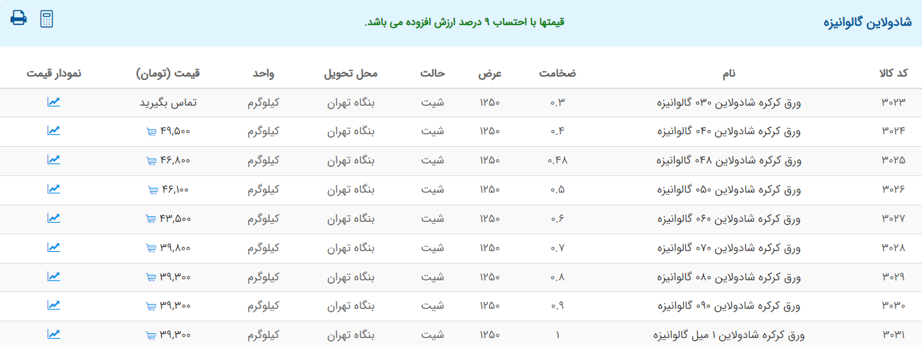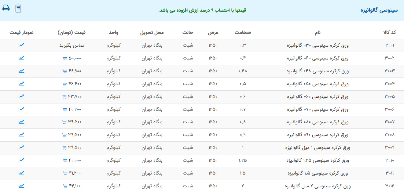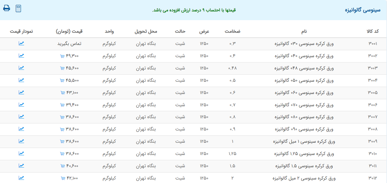 اعلام موجودی ورق گالوانیزه