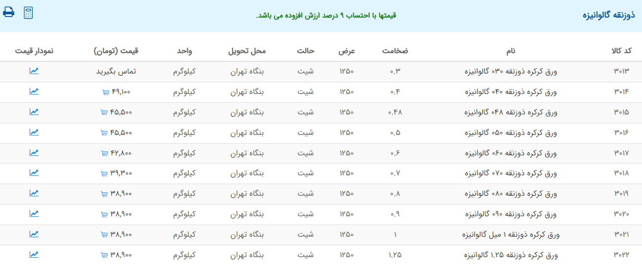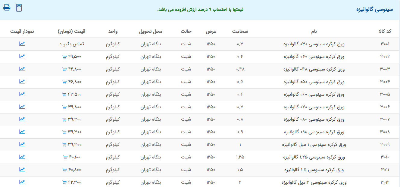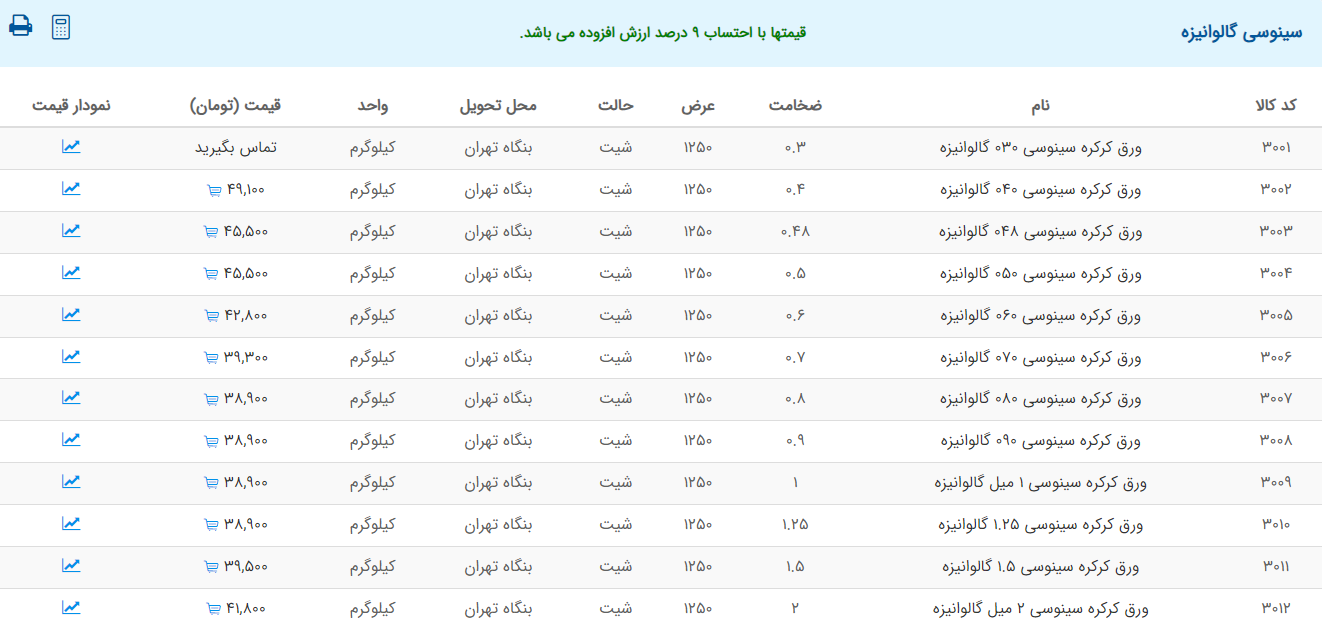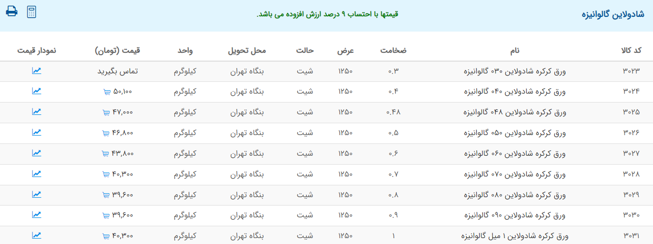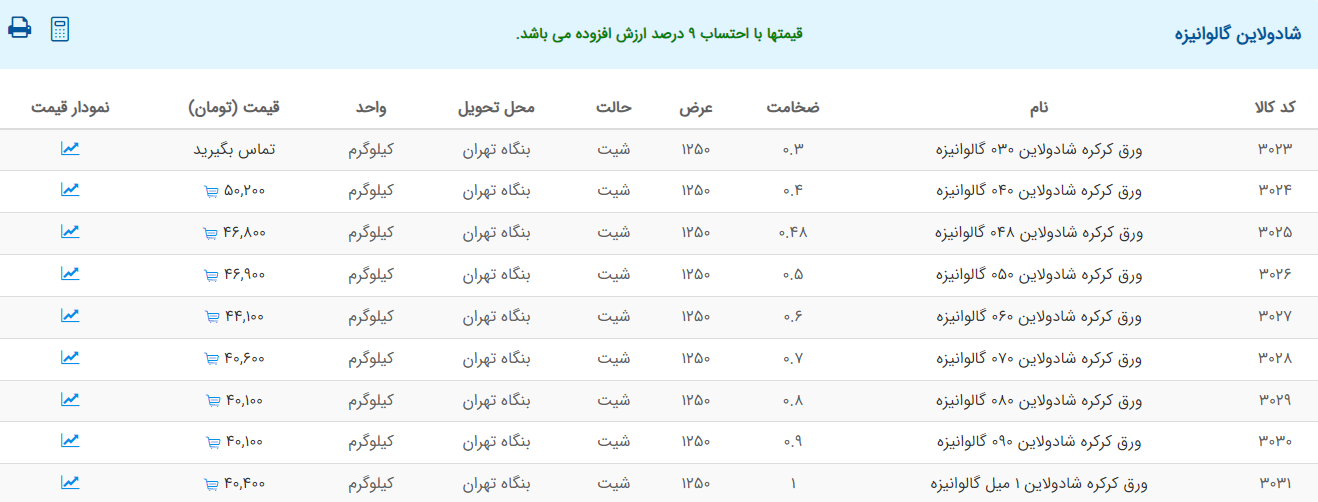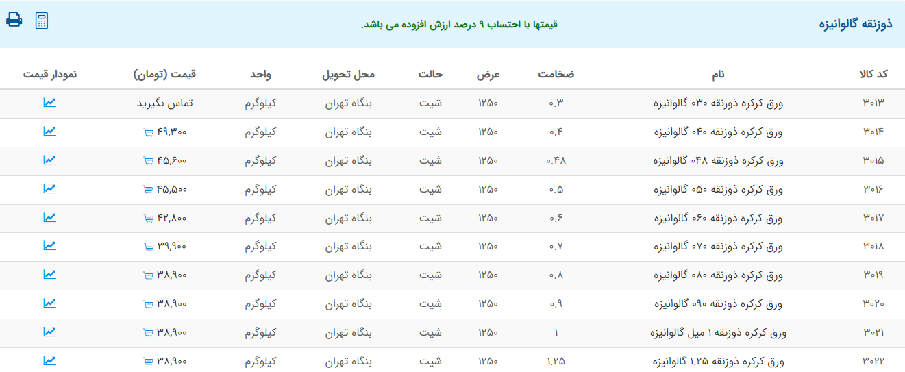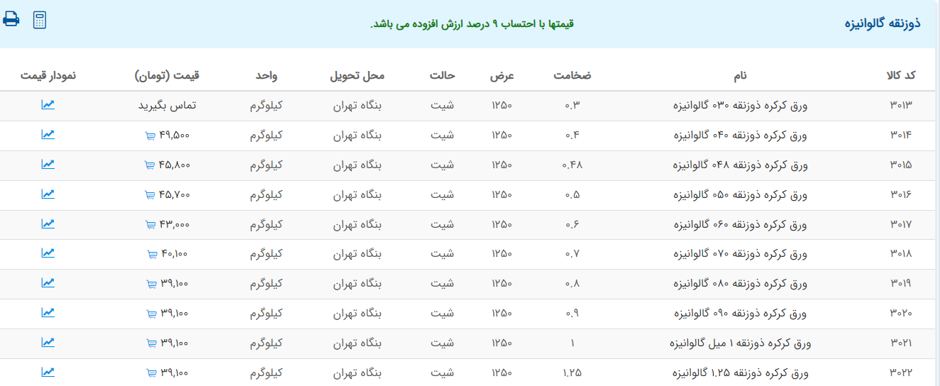 اعلام موجودی ورق گالوانیزه