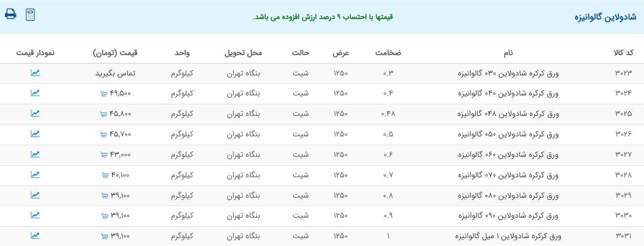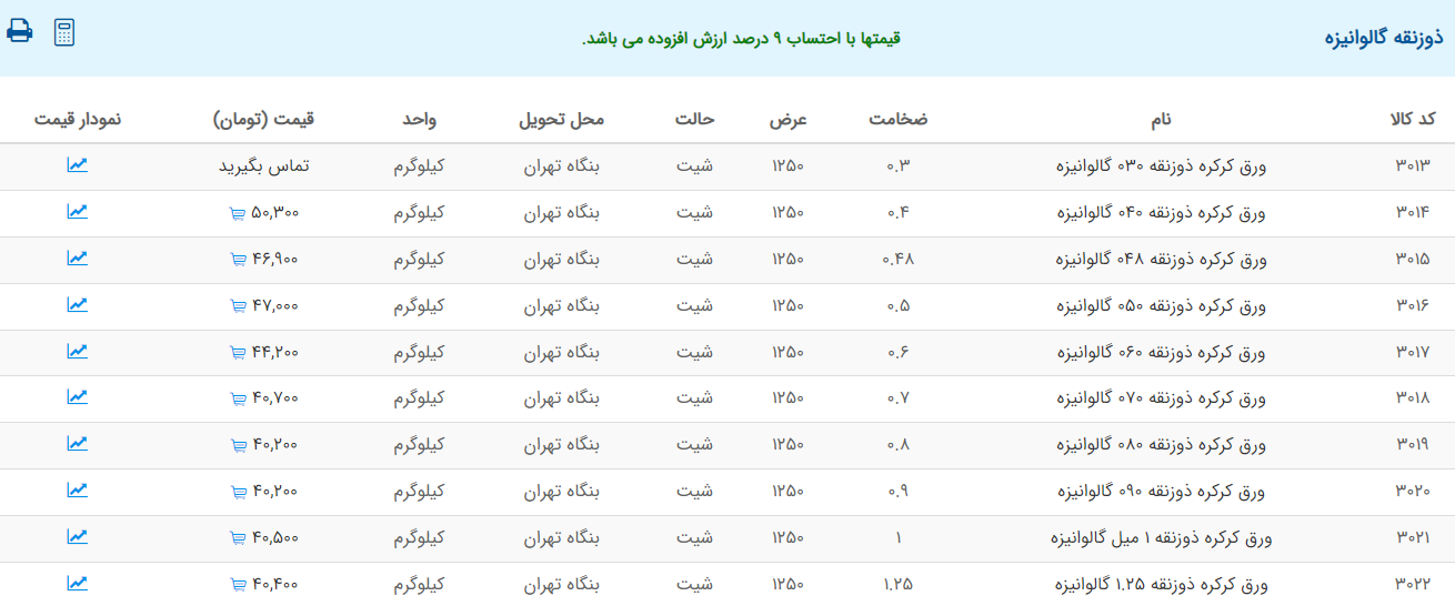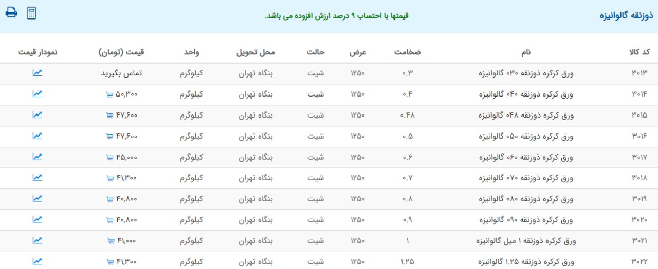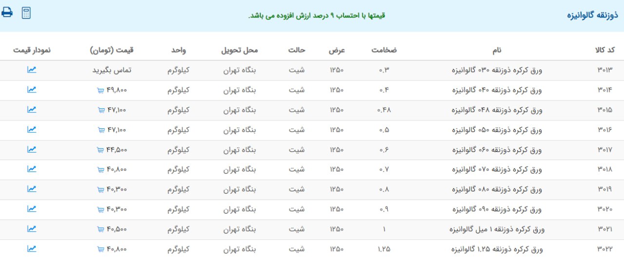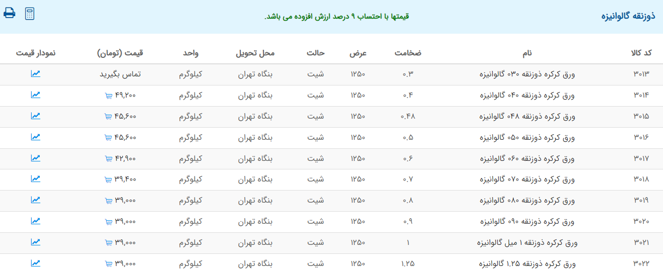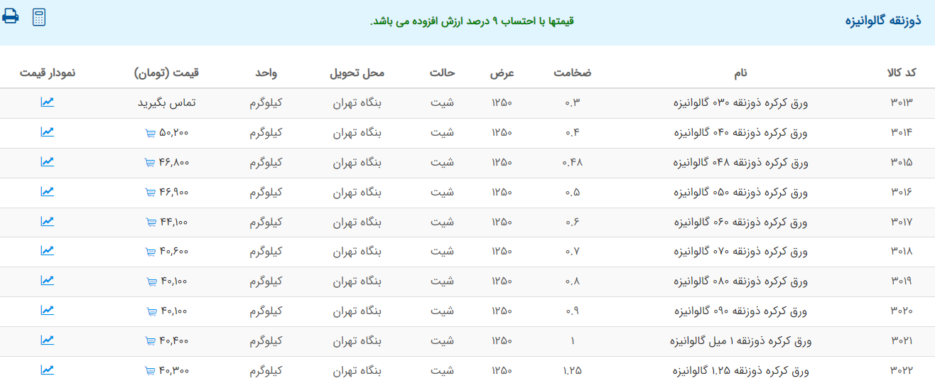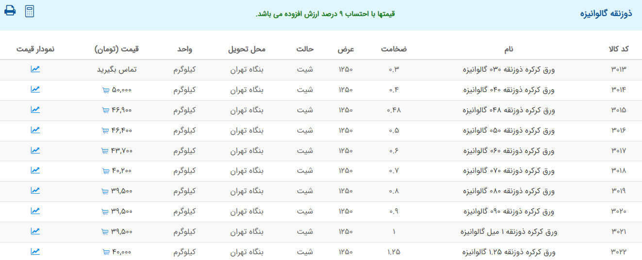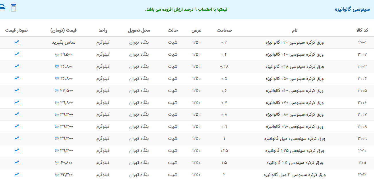 اعلام موجودی ورق گالوانیزه