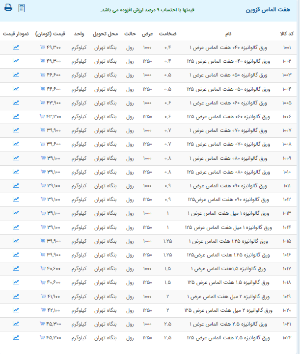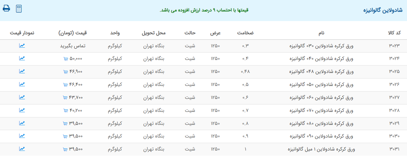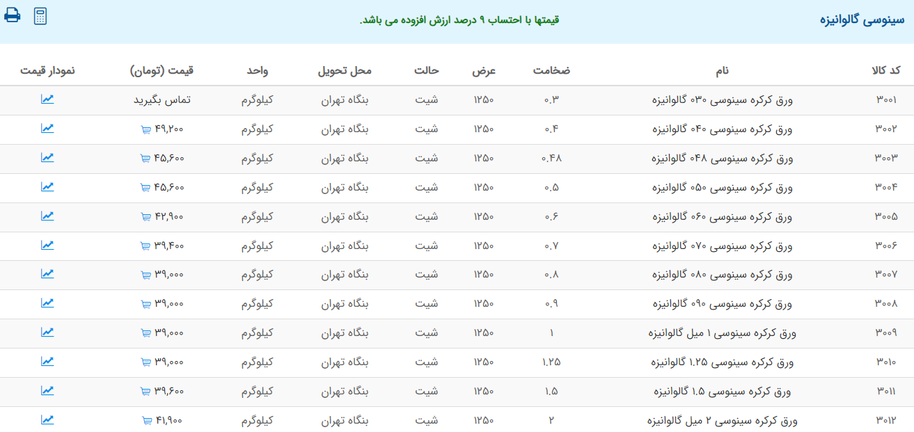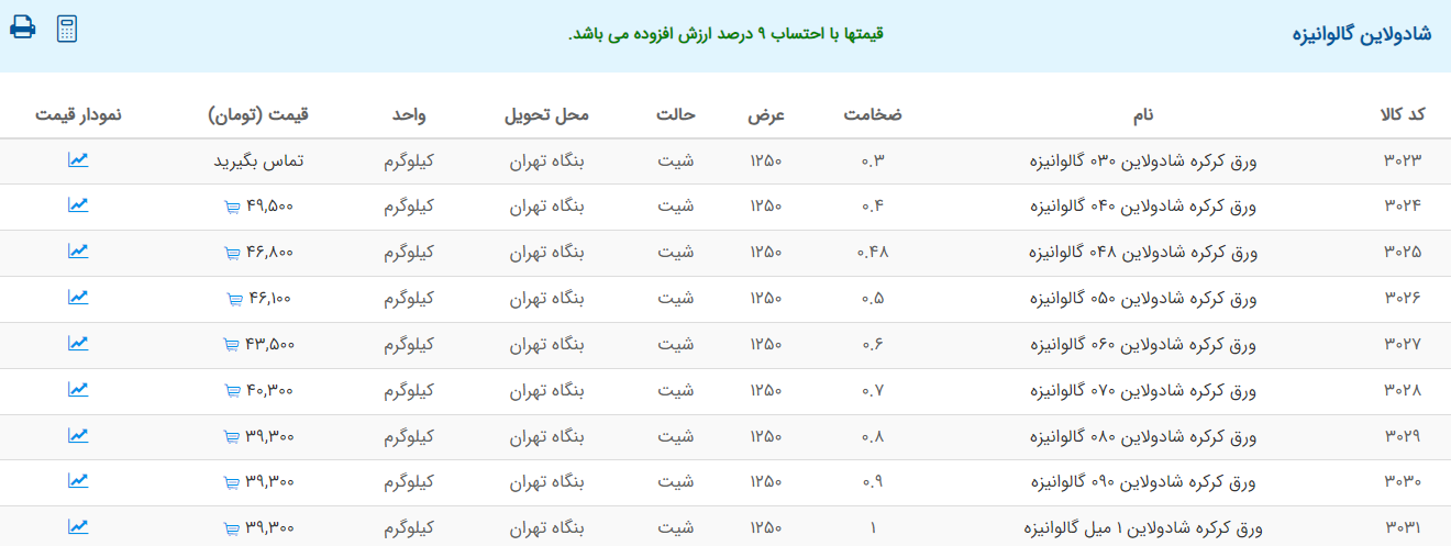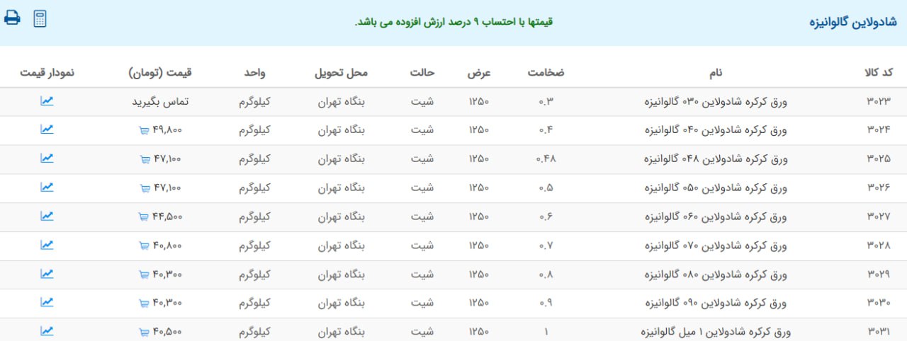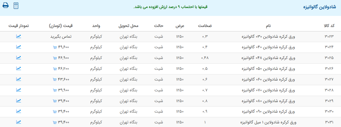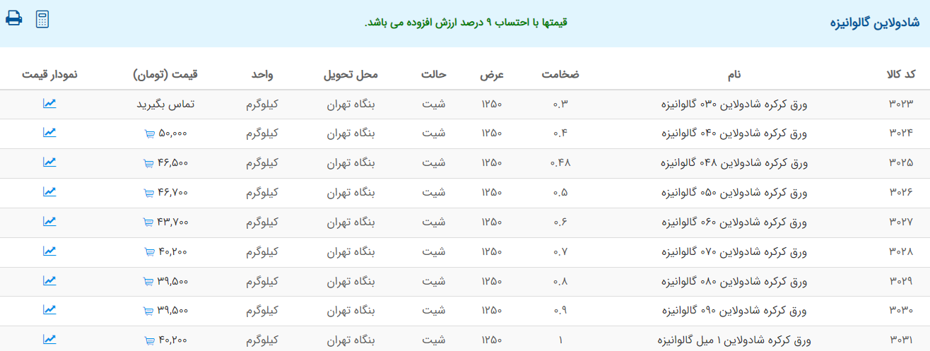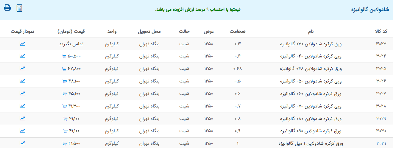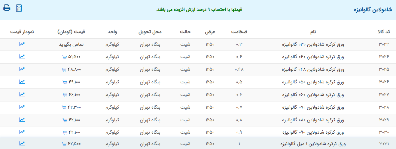 اعلام موجودی ورق گالوانیزه