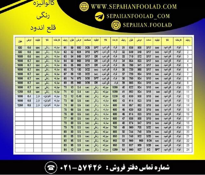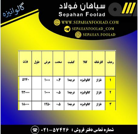 🟡⚫️شركت سپاهان فولاد⚫️🟡 ⭕️موجودی گالوانیزه⭕️ ✅40*1000 ✅40*1250 ✅50*1000 ✅50*1250 ✅60*1000 ✅60*1250 ✅70*1000 ✅80*1250 ✅1/2*1000 ✅1/5*1000 ✅1/8 ...