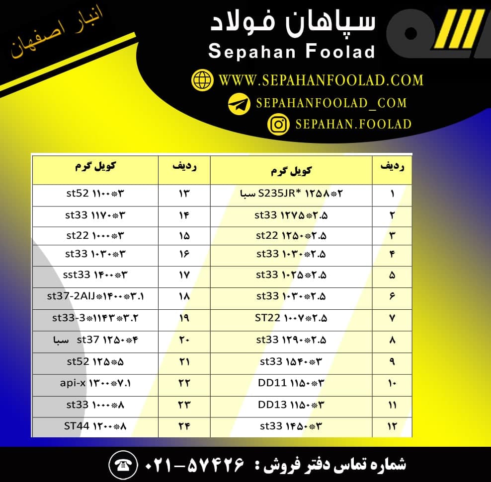 🟡⚫️🟡سپاهان فولاد 🟡⚫️🟡 کویل گرم 2*128 st33 کویل گرم 2.5*1015 st22 کویل گرم 2.5*1250 st22 کویل گرم 2.5*1000 st22 کویل گرم 2.46*1262 st22 کویل گرم 5*1250 st22 ...