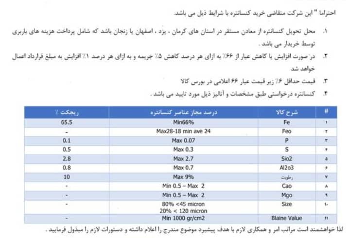 امکان تامین کنسانتره آهن با مشخصات پیوست به هر میزان تحویل درب معدن مورد نیاز است.با تشکر