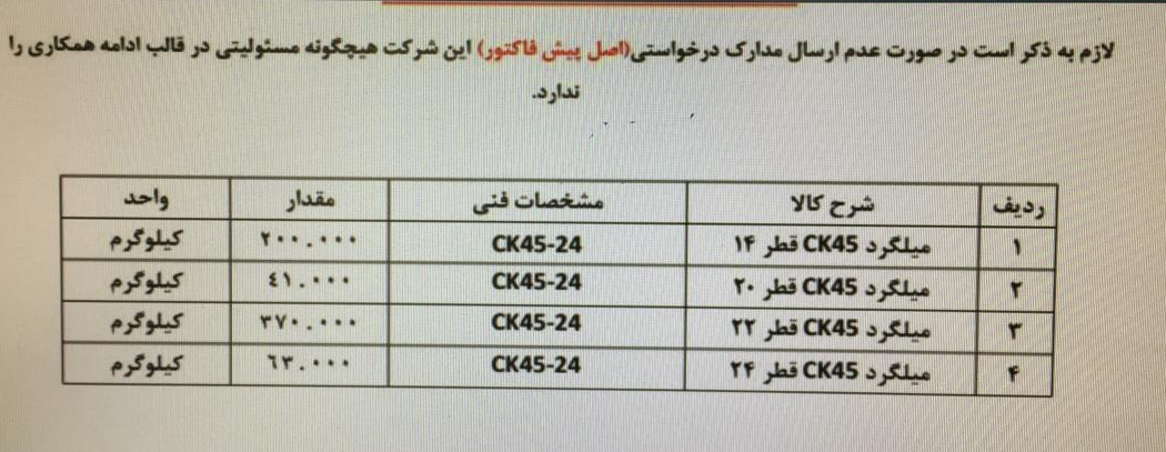 تکنو صنعت اصفهان خریدار ck 45 یزد گرد85 -----95*95---- 6 متری -----3 شاخه ck 45 یزد گرد260---95*95----3 متری-------1 شاخه mo 40 گرد 50-------1 تن تلفن تماس 0313 ...